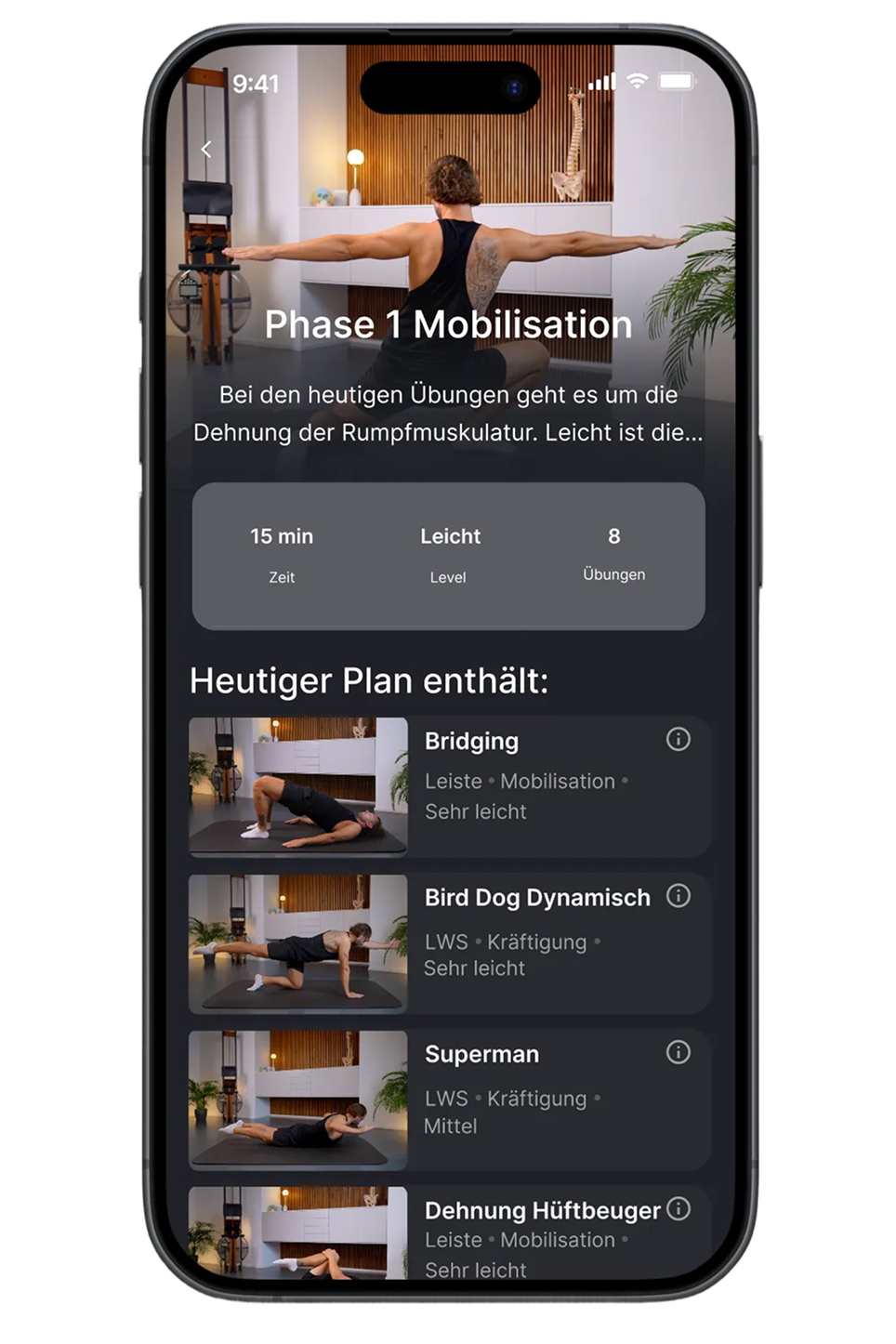 Ja, da Du die Übungen jederzeit online machen kannst, kannst Du sie flexibel in Deinen Alltag integrieren. Wenn Du eine Beschwerderegion angibst, dauert Dein Plan in der Regel etwa 15 Minuten. Bei jeder weiteren Beschwerderegion verlängert sich der Plan um ungefähr 4 Minuten.